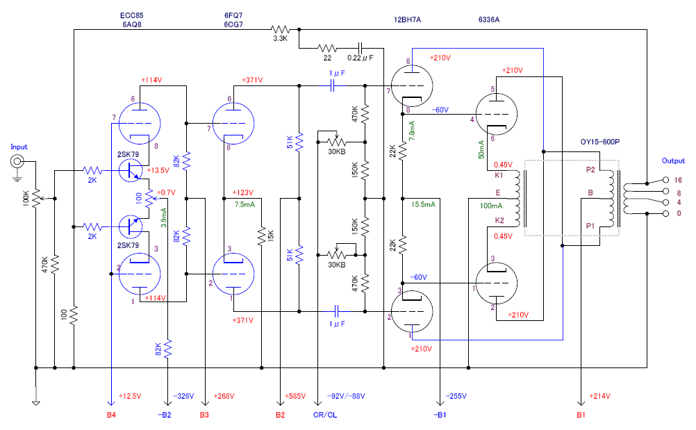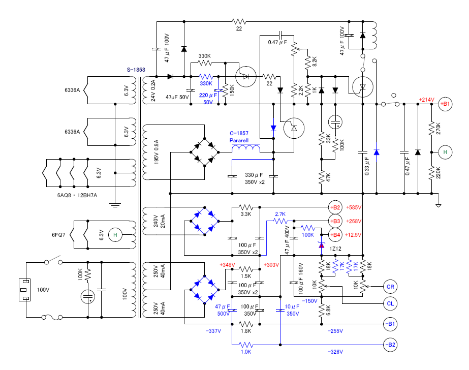 さらにカスコード段のグリッド電位に+12Vを供給する為に100KΩと12Vツェナーにて+B4 と初段差動の負電源ーB2 を増設しています。