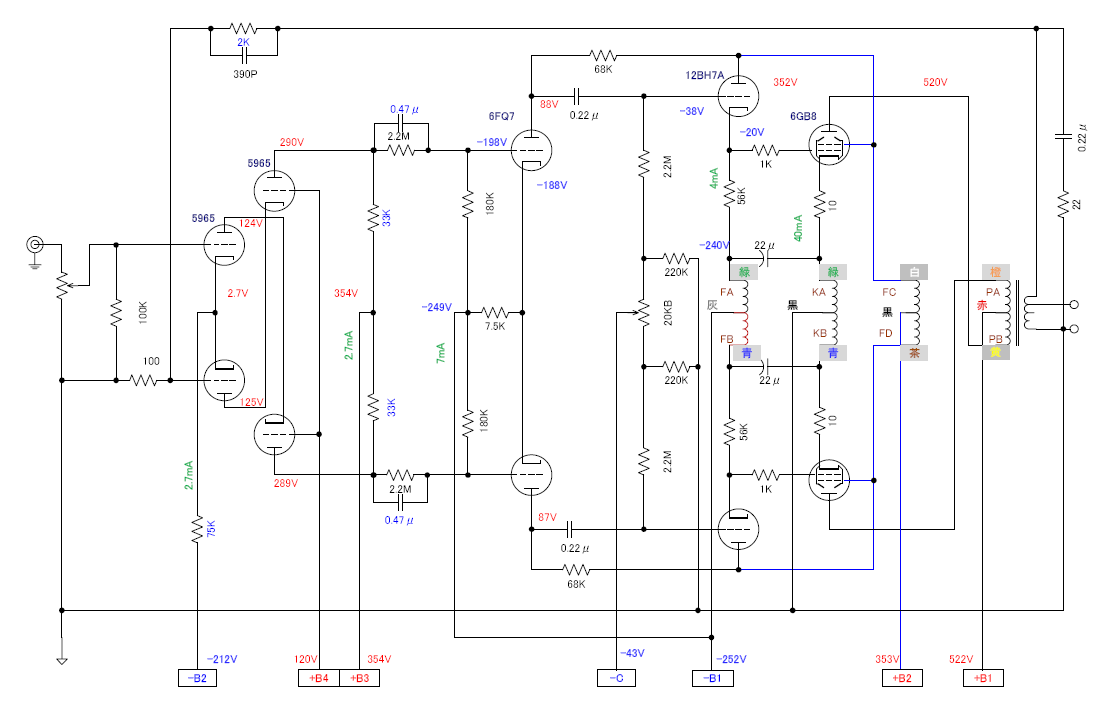 大型三極管8045Gをドライブする為に編み出されたLUXオリジナルは差動2段の後ろにもう1段増幅段が有り、独自のブートストラップにてカソードフォロワ-を介して出力管をドライブしていましたが、全部で合計4段の増幅は5極管やビーム管のドライブにはそこまで必要ないのが正直なところ。