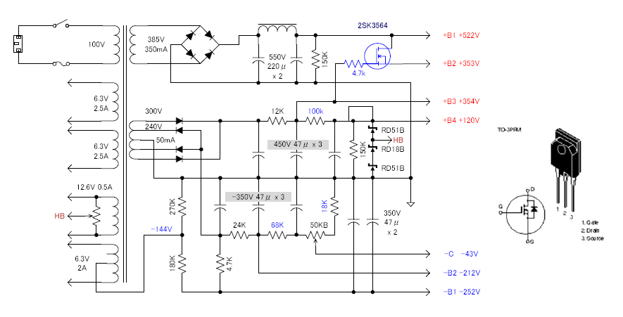これは300V巻線の電流容量に余裕がないため、こちらから供給すると最大出力付近ではSG電流が増え電圧降下が大きくな り出力に制限がかかるのを避けるための措置です。バイアスのC電源はスクリーン電圧が下がることにより必要な出力管のバイアスも下がるので抵抗値を調節しています。